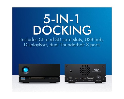 Док-станція 1big ємністю 4 ТБ від LaCie була розроблена як епіцентр робочих процесів у форматі 4K. Він поєднує в собі 3,5-дюймовий жорсткий диск Seagate IronWolf Pro 7200 об/хв SATA, що забезпечує швидкість передачі даних до 280 МБ/с, два порти Thunderbolt 3, порт USB 3.0 Type-A, вихід DisplayPort 1.4 для 8K/60 Гц , Відео 4K / 120 Гц, 1080p та 720p, а також слоти для карт пам'яті SD та CompactFlash. Завдяки алюмінієвому корпусу та терморегульованому вентилятору робочі температури залишаються низькими. У той час як один з портів Thunderbolt 3 використовується для підключення 1big Dock до вашої сумісної системи, що працює як мінімум на Windows 10 або MacOS 10.12, інший можна використовувати для послідовного підключення до шести додаткових пристроїв або забезпечення до 70 Вт потужності заряджання. У комплект LaCie 1big Dock ємністю 16 ТБ входять кабель Thunderbolt 3 40 Гбіт/с, кабель USB 3.0 та зовнішній блок живлення.