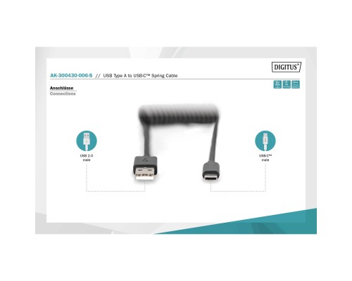 За допомогою спірального кабелю DIGITUS USB 2.0 - USB A - USB C ви можете заряджати свої смарт-пристрої, такі як смартфони, планшети тощо. Потужність зарядки становить 60 Вт (20 В/3 А). Крім того, ви можете синхронізувати свої дані з ПК або ноутбуком зі швидкістю передачі даних 480 Мбіт/с. Завдяки гнучкій довжині та спіральній конструкції його можна використовувати будь-де. Ідеально підходить для зарядки смартфона в машині або як запасний кабель для робочого столу, оскільки кабель легко зберігати де завгодно.