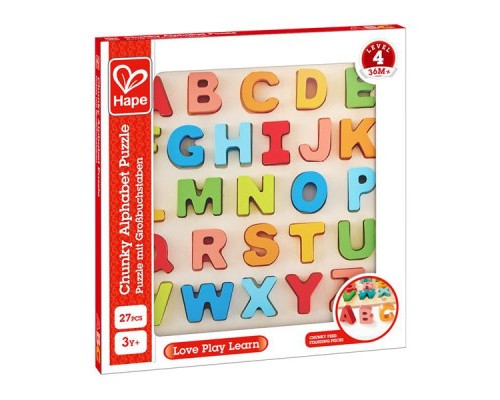Дерев'яний пазл Hape Англійська абетка підходить для дітей від 3 років. Ця барвиста головоломка знайомить малюків із великими літерами латинського алфавіту, щоб вони могли зробити перші кроки до читання та письма.