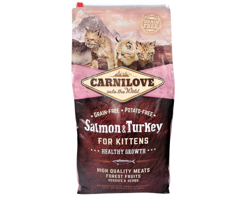 Carnilove Salmon&Turkey Kitten — повнораціонний беззерновий сухий корм класу холістик із лосося й індички для здорового росту кошенят.